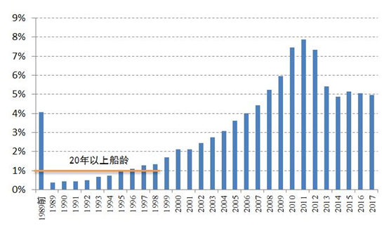 船舶拆解量与新船价格具有明显的负相关性,老旧船舶拆解量越少,新船价格越高。过去三十年,全球老旧船舶拆解有两段时间处于低谷,一是1988-1991四年间,二是2004-2008五年间,这两段时间的新船价格都处于持续上升期,而此后随着老旧船舶拆解量的增长新船价格持续下滑。上一轮拆船高潮持续12年(1992-2003年),年均拆船量2200万DWT,占同期全球船队平均规模的2.8%;本轮拆船高潮已持续9年(2009-2017年),年均拆船量4100万DWT,占同期全球船队平均规模的2.6%。